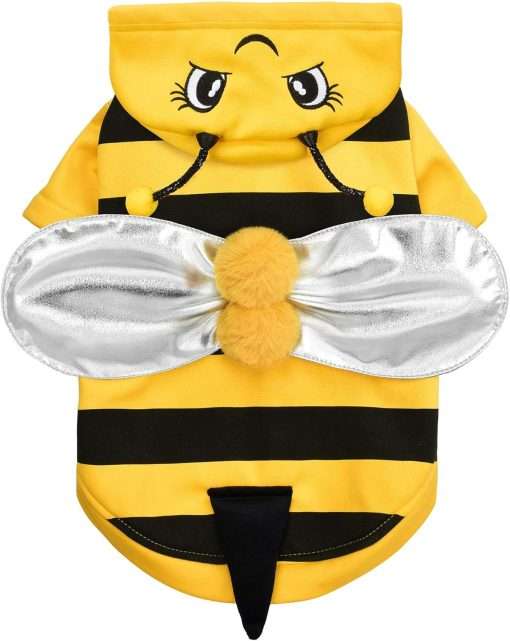 Adorable Bee Pattern: The yellow and black stripe pattern on this adorable hoodie is inspired by bumblebees and features an embroidered bee cap and antennae. Your pet’s back has silver wings and yellow pom-poms, giving the impression that it is playing like a bee in a garden.