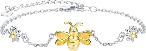 Palpitate Bee Bracelet Sterling Silver Bee Gifts Yellow Created Opal Bracelet Daisy Jewelry for Women Adjustable Chain